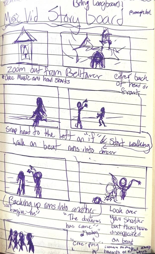 The first rough storyboard sketch I did for the beginning of the music video. I wrote out the lyrics and stage directions to help me remember what to do when we started filming