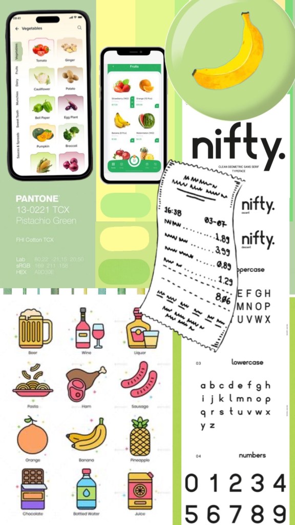 When creating the mood board I knew I wanted to center the design around the a clean light green pistachio colour – which to me invokes a feeling of minimalism and fresh groceries. I also include a banana icon/logo because of its nice contrast with the pistachio green and connotation of being one of the most affordable and recognizable grocery items.