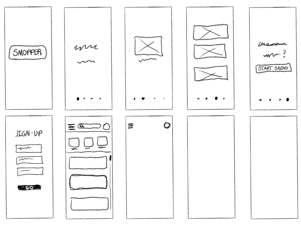 My first wireframe was done digitally and consisted of an illustrated tutorial/introduction where the user could get a sense of what smopper does and is all about. This is something I was inspired to do from the “Forest” app – a pomodoro timer app that helps you stay off your phone and accomplish tasks. They start off with a short illustrated tutorial which I really enjoyed beacuse it made me feel like I was eased into the app’s user experience rather than being thrown straight into the deep end like you are with others.